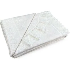Coordinato alla 2 federe cm. 50×70 delle stesso materiale rifinite con le stesso pizzo macramè del copriletto.