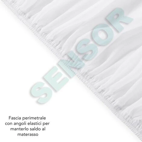 È inoltre dotato tutto intorno di una fascia perimetrale con angoli elastici in modo che rimanga saldamente ancorato al materasso.