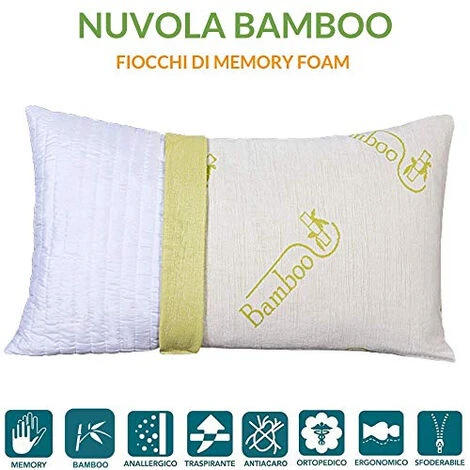 NOVITA’ ASSOLUTA – 1 CUSCINO FIOCCO DI MEMORY EFFETTO PIUMA D’OCA MORBIDO ANALLERGICO E TRASPIRANTE CON FODERA IN FIBRA DI BAMBOO. AUTOMODELLANTE – 1 GUANCIALE IN MEMORY FOAM ADATTO A CHI HA PROBLEMI DI CERVICALE, SEGUE LA FORMA DEL COLLO E DELLA TESTA SENZA CREARE PUNTI DI PRESSIONE. SUPER IGENICO – RIVESTIMENTO IN BAMBOO SFODERABILE CON CERNIERA E LAVABILE IN LAVATRICE, ANALLERGICO, ANTIBATTERICO. BAMBOO É IL TESSUTO DI ORIGINE VEGETALE IN GRADO DI ASSORBIRE L’UMIDITÀ DEL CORPO, DI ASSORBIRE IL SUDORE (GRAZIE ALLA SUA MOLTEPLICITÀ DI MICRO-CUSCINETTI D’ARIA, FAVORENDO LA TRASPIRAZIONE ED EVITANDO IL PROLIFERARE DEI BATTERI) E DI MANTENERE LA TEMPERATURA CORPOREA AD UN GIUSTO LIVELLO. PROTEZIONE ANTIACARO – IL GUANCIALE HA UN RIVESTIMENTO CON OLI ESSENZIALI DI ALOE VERA COMPLETAMENTE ANALLERGICO. IL TESSUTO È AD ARMATURA DI TELA, GARANTISCE TENUTA ALLA FUORIUSCITA DELL’ IMBOTTITURA E NELLO STESSO TEMPO PERMETTE LA TRASPIRAZIONE. FODERA ANTIBATTERICA, GRAZIE ALLO SPECIALE TRATTAMENTO TERMO MECCANICO, CREA UNA BARRIERA IMPENETRABILE AGLI ACARI DELLA POLVERE. MISURE – CUSCINI LETTO 42X72 ALTI 15 CM, 100% MADE IN ITALY.