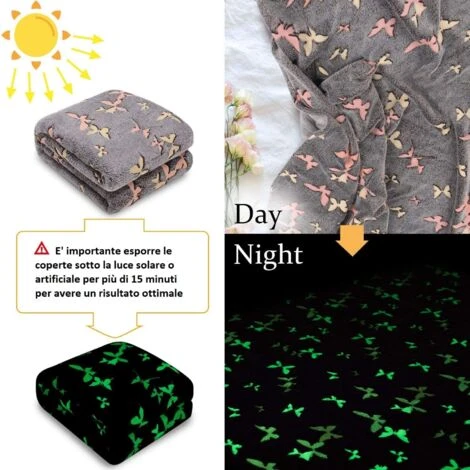 Soffice plaid realizzato con soffice pile 240 GSM, ideale da regalare o da usare per decorare le nostre case, misura 130×150, versione GLOW, si ricarica con la luce del giorno e si illumina al buio. Avviso di sicurezza