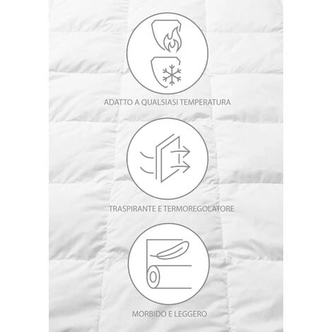 Praticità: Realizzato Selezionando i migliori materiali l’imbottitura Naturale in Vero Piumino D’oca 90% e Piumette al 10% ideale per le stagioni Invernale – Autunnale con imbottitura in vera piuma 320 Gr/Mq, grazie all’alta traspirazione e alla proprietà della Piuma con la sua funzione Termoregolante il piumino garantirà una massima qualità del sonno
