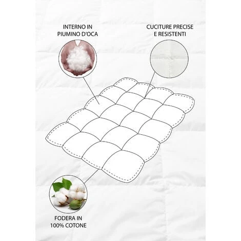 Composizione: 90% Piumino d’oca 10% Piumette d’oca, tessuto in raso di cotone colore bianco trapuntatura a quadri per una stabilità e una distribuzione omogenea della piuma