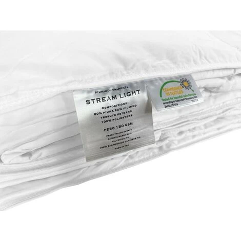 Piumino d’oca ‘ STREAM 150 gr. ESTIVO ‘ leggero imbottito con 80% piuma d’oca e dal 20% di piumino oca (la parte più pregiata dell’oca), realizzato nella versione estiva, soffice e leggero che dona il giusto tepore nella stagione meno fredda.