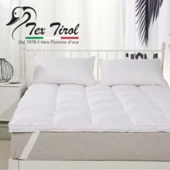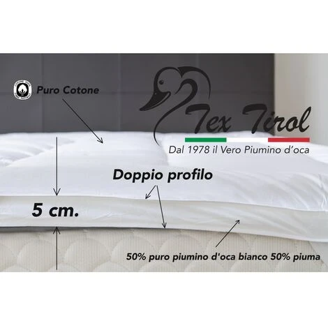 Topper per materasso ‘ Tex Tirol Dolomiti ‘ imbottito con 50% di puro piumino d’oca bianco (la parte più pregiata dell’oca) e dal 50% di piuma oca, foderato in puro cotone realizzato in altezza di 5 cm. , spesso e confortevole.